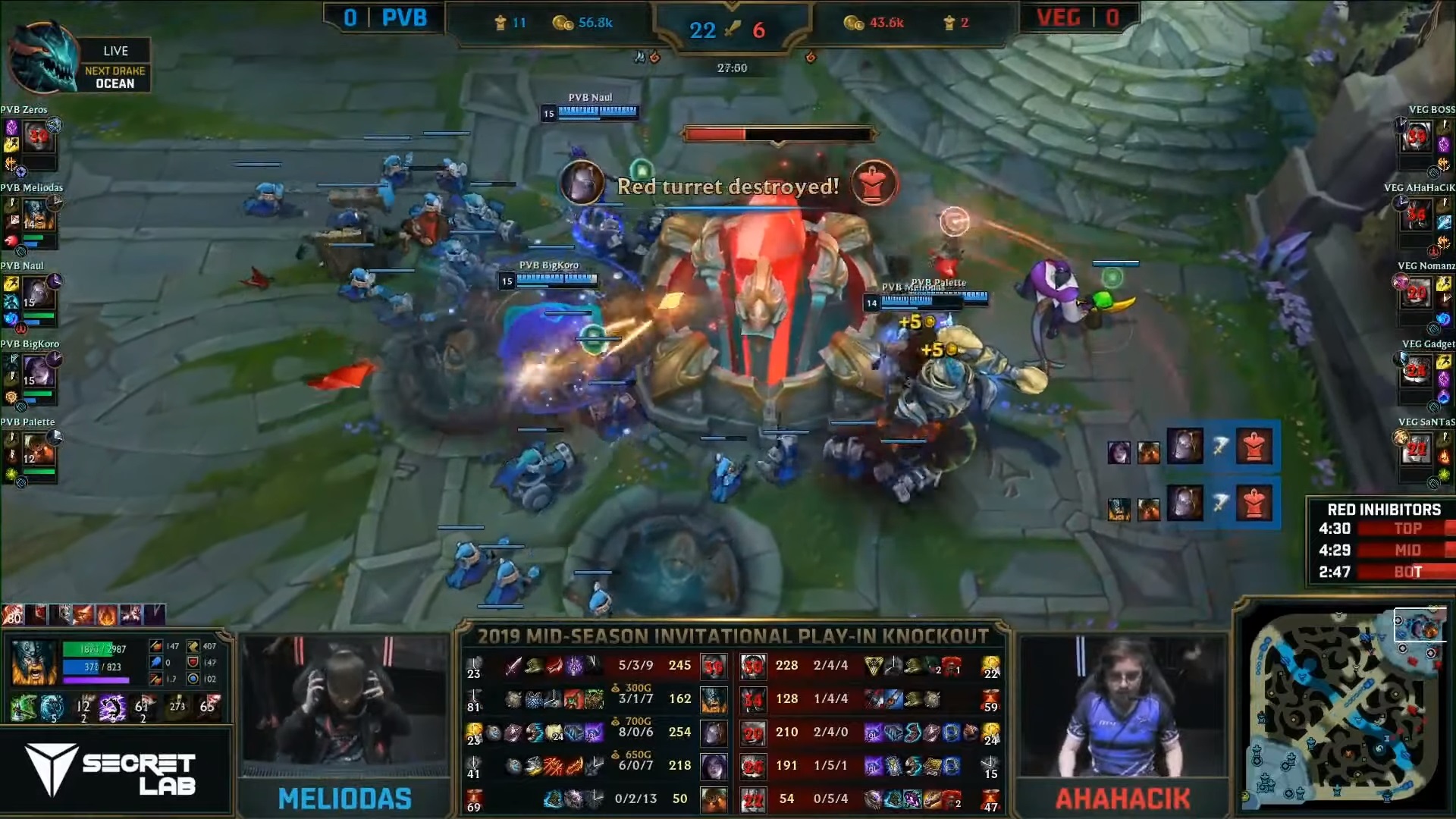 Cái gì không sai thì không phải sửa, cặp đôi đường dưới của VEG tiếp tục lấy Ashe – Tahm Kench, đặc biệt họ còn lấy Corki và Vi – lựa chọn khiến cho tất cả mọi người bất ngờ. Bên phía PVB không có quá nhiều sự thay đổi so với các game đấu trước. Có vẻ như VEG đã làm khá tốt trong giai đoạn cấm chọn.