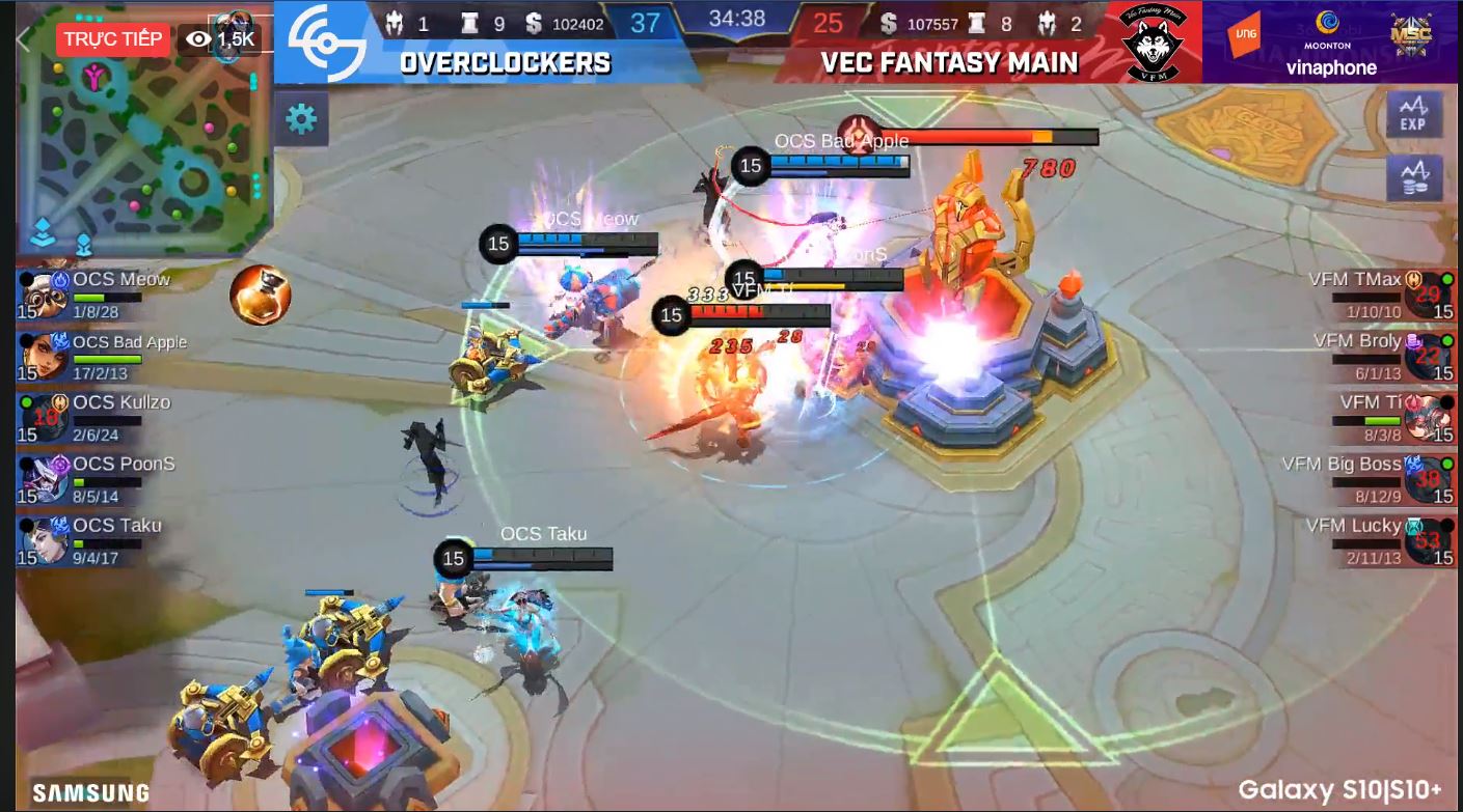 Nhưng thực sự, Overclockers (OCS) đã thể hiện phong độ vô cùng xuất sắc khi có một mạch thắng dài trong ngày thi đấu thứ hai tại Pro League. Đỉnh cao nhất phải kể đến trận thi đấu trực tiếp đẩy Vec Fantasy Main (VFM) xuống nhánh thua. Một trận đấu kéo dài hơn 30 phút đồng hồ và hai bên liên tục đưa đẩy khiến khán giả vừa xem vừa giật mình thon thót. Ở những phút đầu, VFM có lợi thế hơn khi Broly cần trong tay tướng tủ Claude và Tí với Thamuz đang cực mạnh trong meta mùa mới. Thế nhưng, OCS PoonS cầm trong tay Hayabusa và OCS Bad Apple với Esmeralda đã làm nên chuyện. Với cách phân bổ sức mạnh hợp lí, mặc dù không hề có vị trí xạ thủ, OCS vẫn khiến đối thủ tâm phục khẩu phục và giành được phần thắng. Cũng nhờ chiến thắng quyết định này, OCS đã vươn lên đứng đầu bảng xếp hạng vòng đấu, đẩy nhà vô địch của mùa giải trước là Vec Fantasy Main xuống vị trí thứ hai.