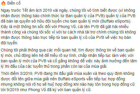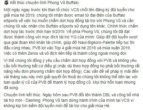 Không những vậy, ban quản lý mới sau đó của đội tuyển này còn chấm dứt hợp đồng trước thời hạn dù cho hợp đồng giữa hai bên khi đó có thời hạn đến tháng 9/2019, nhưng ban quản lý đã quyết định chấm dứt hợp đồng trước khi VCS khởi tranh có một ngày và khiến những thủ tục pháp lý diễn ra sau đó diễn ra vô cùng phức tạp. Cuối cùng, Phong Vũ quyết định không khởi kiện với Buffalo dù nếu đơn phương chấm dứt hợp đồng, bên phía đội tuyển sẽ phải bồi thường rất nặng.