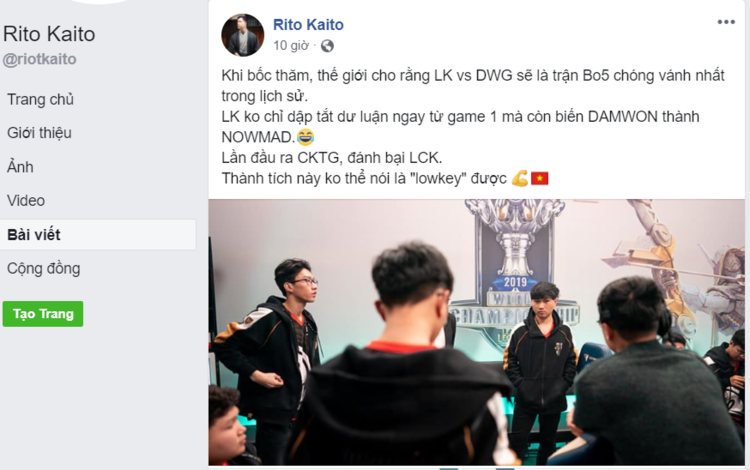 Và mỗi lần Việt Nam tham dự các giải đấu LMHT ở cấp độ Thế giới, cái tên Riot Kaito lại được nhắc đến, với cả sự tôn trọng lẫn nuối tiếc. Vào tối qua, anh chàng này đã bất ngờ "tái xuất", với một đoạn status khen ngợi màn trình diễn của các chàng trai LK trước "gã khổng lồ" DAMWON.