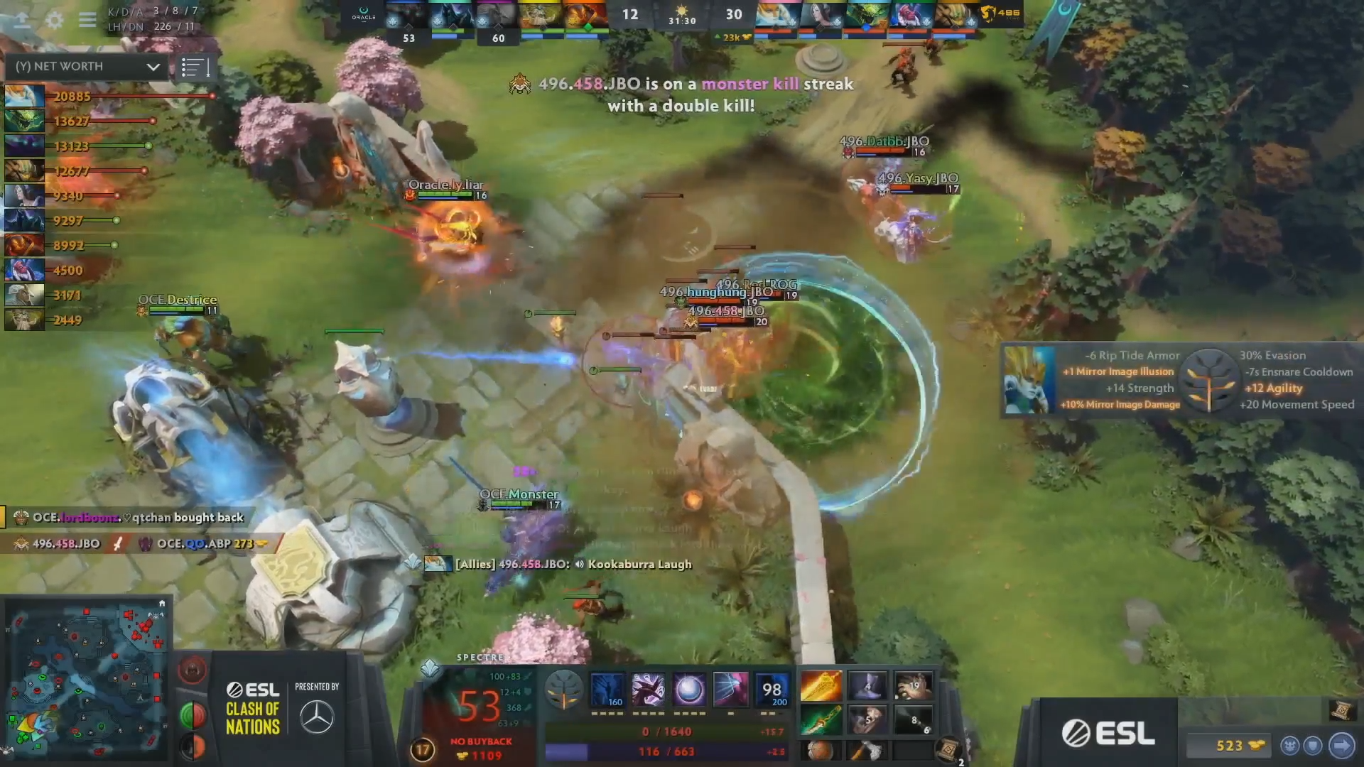 Sức mạnh của Viper ở thời điểm Early và Mid game đã giúp cho 496 Gaming vượt qua giai đoạn khó khăn của trận đấu. Đại diện của Dota 2 Việt Nam liên tục dồn ép đối thủ bằng những pha Stick 4 người và Snowball khiến cho QO và các đồng đội không kịp trở tay. Với một Spectre có phần tham lam khi lựa chọn mua Midas trong đội, team Oracle không thể chống trả lại sức ép dồn dập đến từ phía 496 Gaming.