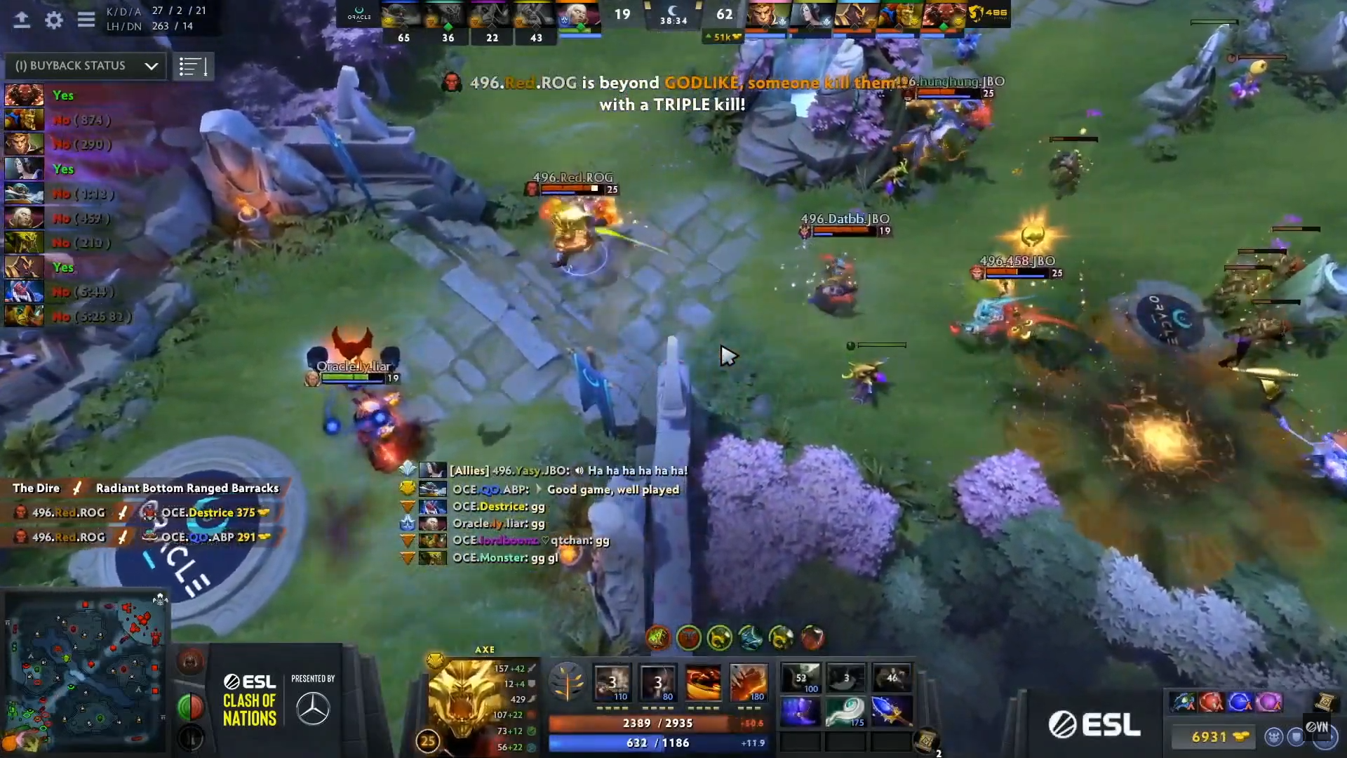 Ở game đấu cuối cùng này, team Oracle tiếp tục tín nhiệm đội hình đã giúp họ chiến thắng ở trận đấu trước đó. Nhưng lần này, thử thách mà QO và đồng đội phải đối mặt lại là Axe của Red và Batrider của hTz - 2 hero đã làm nên thương hiệu của 2 game thủ này. Suốt từ Early Game đến Late Game, Axe và Batrider tung hoành ngang dọc trên khắp bản đồ. Bộ đôi này cứ đi đến đâu là đối phương ngã xuống đến đấy. Trận đấu kết thúc ở phút thứ 38 với khoảng 52.000 vàng dành cho 496 Gaming, cùng với đó là 28 mạng dành cho Red và 13 mạng của hTz. 496 Gaming đã có chiến thắng thuyết phục trước team Oracle để tiếp tục chặng đường của mình tại ESL Clash of Nations.
