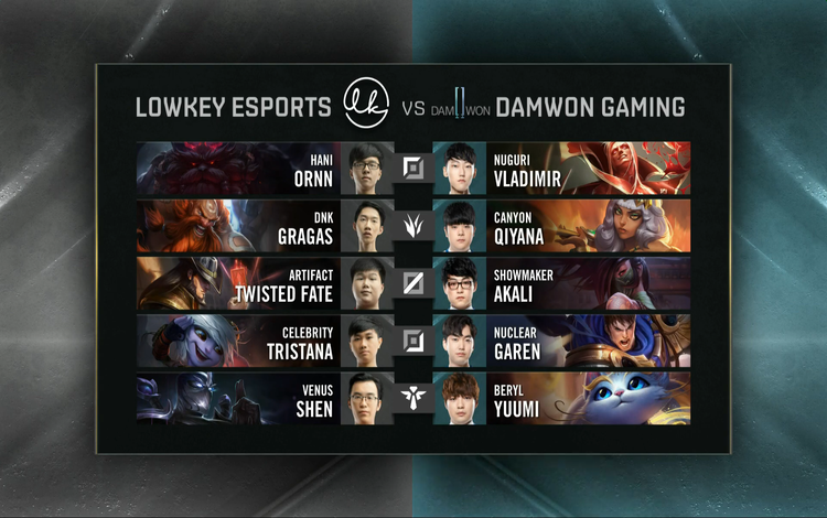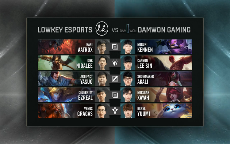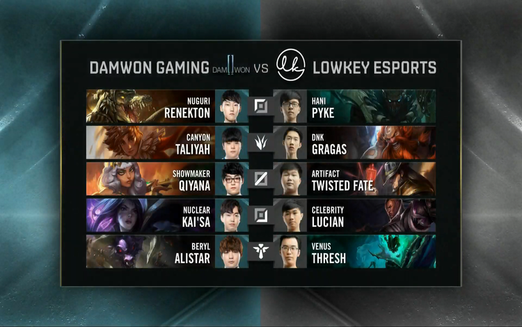 - Trong bốn trận đã thi đấu, Lowkey Esports hai lần có được chiến công đầu, trong khi con số này của DAMWON Gaming chỉ là một lần.